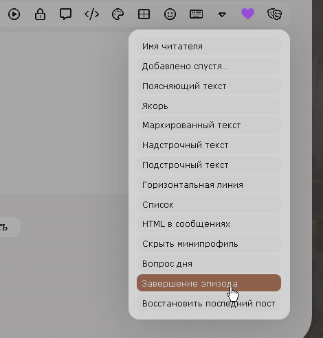 Также для возможности фиксировать завершения эпизода есть кнопка вставки доп. тега в последний пост : Скриншот